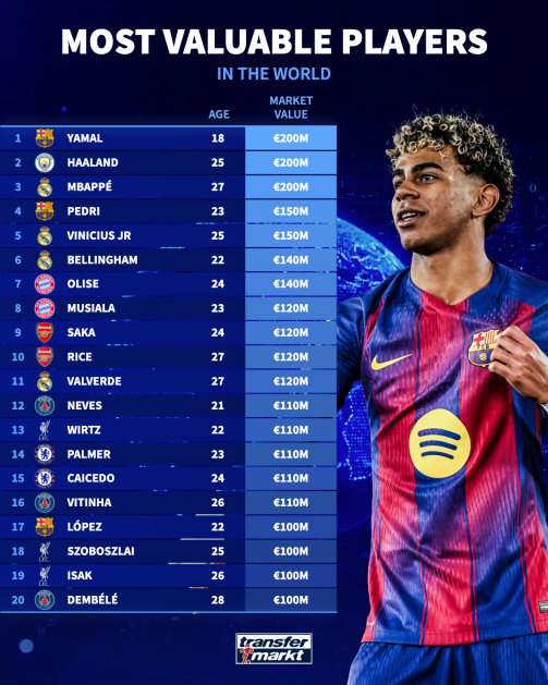 Taking first position as the most valuable player on the planet is teenage talent, Lamine Yamal. The 18-year-old already has a market value of €200 million. Despite still being so young, he has already won two LaLiga titles with Barcelona, and lifted Euro 2024 with Spain. He is consistently shining on the biggest stage for club and country. In second spot is Manchester City's prolific striker Erling Haaland (€200m) who beats third placed Kylian Mbappé (€200m) as he is two years younger than the Real Madrid superstar.